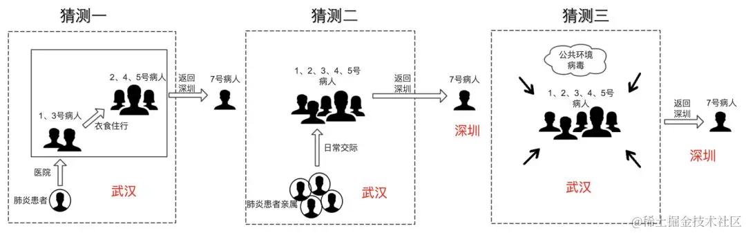 第三种可能性是1-5号病人由于一个未知的公共源在武汉期间被感染,将其传播给7号病人。\