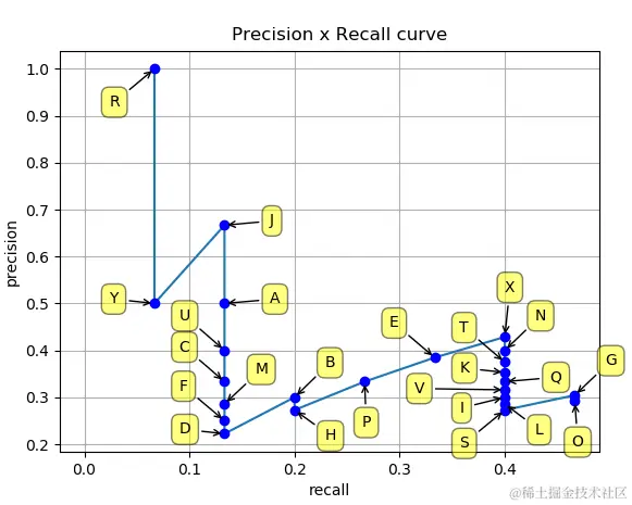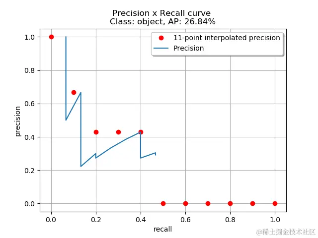 得到 P-R 曲线就可以计算 AP(P-R 曲线下的面积),要计算 P-R 下方的面积,一般使用的是插值的方法,取 11 个点 [0, 0.1, 0.2, 0.3, 0.4, 0.5, 0.6, 0.7, 0.8, 0.9, 1] 的插值所得