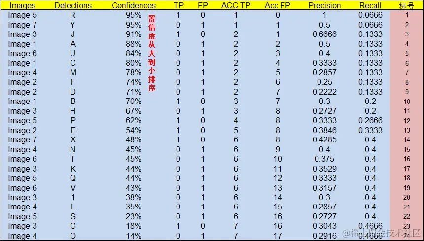 通过上表,我们可以绘制出 P-R 曲线(因为 AP 就是 P-R 曲线下面的面积),但是在此之前我们需要计算出 P-R 曲线上各个点的坐标,根据置信度从大到小排序所有的预测框,然后就可以计算 Precision 和 Recall 的值,见下表。(需要记住一个叫累加的概念,就是下图的 ACC TP 和 ACC FP)