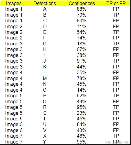 根据上图以及说明,我们可以列出以下表格,其中 Images 代表图片的编号,Detections 代表预测边框的编号,Confidences 代表预测边框的置信度,TP or FP 代表预测的边框是标记为 TP 还是 FP(认为预测边框与 GT 的 IOU 值大于等于 0.3 就标记为 TP;若一个 GT 有多个预测边框,则认为 IOU 最大且大于等于 0.3 的预测框标记为 TP,其他的标记为 FP,即一个 GT 只能有一个预测框标记为 TP),这里的 0.3 是随机取的一个值。