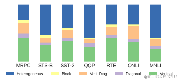 以下是BERT在七项GLUE任务中五种注意力的比例(每一列代表所有层中所有头部的100%):
