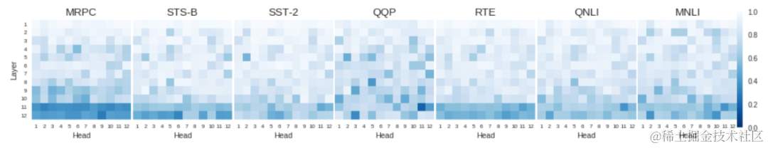 虽然具体的比例因任务而异,但在大多数情况下,可能有意义的模式占BERT所有自注意力权重的不到一半。至少有三分之一的BERT head只关注[SEP]和[CLS] —— 这种策略不能为下一层的表示提供很多有意义的信息。它还表明,该模型严重参数化过度,这解释了最近蒸馏方法的成功尝试 (Sanh, Debut, Chaumond, & Wolf, 2019; Jiao et al., 2019)。