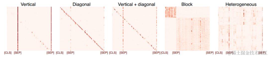 那么BERT的自注意力模式是什么呢?我们找到了五个,如下图所示: