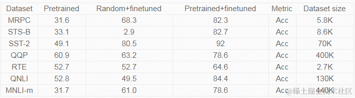 - 从正态分布中随机初始化模型,并对任务数据集进行3个epochs的finetune,然后看看BERT的表现
