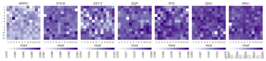 为了确定我们认为对帧语义关系编码有用的两个头是否真的被finetune过的BERT使用,我们进行了一项消融研究,一次禁用一个头(即用统一注意力替换习得的注意力权重)。图6显示了在我们的示例中所有GLUE任务的热图,每个单元格显示的是总体性能,当给定的头被关闭。很明显,虽然整体模式不同任务之间,我们最好随机删除头 —— 包括那些我们确认为编码有意义的信息,应该为最相关的任务。许多头也可以在不影响任何性能的情况下关闭,这再次表明,即使是BERT-base也严重参数化了。