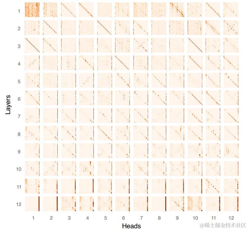 图1,BERT自注意力模式的类型。 每个图像上的两个轴表示输入样本的BERT标记,颜色表示绝对注意力权重(深色表示更大的权重)。\