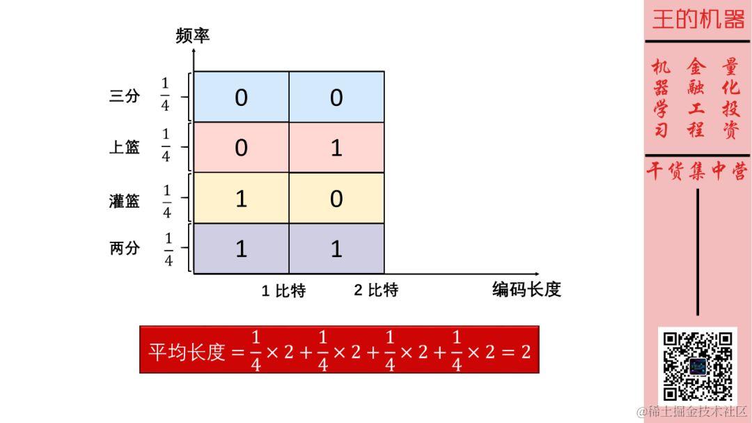 假设哈登两分、三分、上篮、灌篮这四个动作是等概率发生,那面我们可以给编码长度(横轴)和动作频率(纵轴)做一个可视化,如下图。