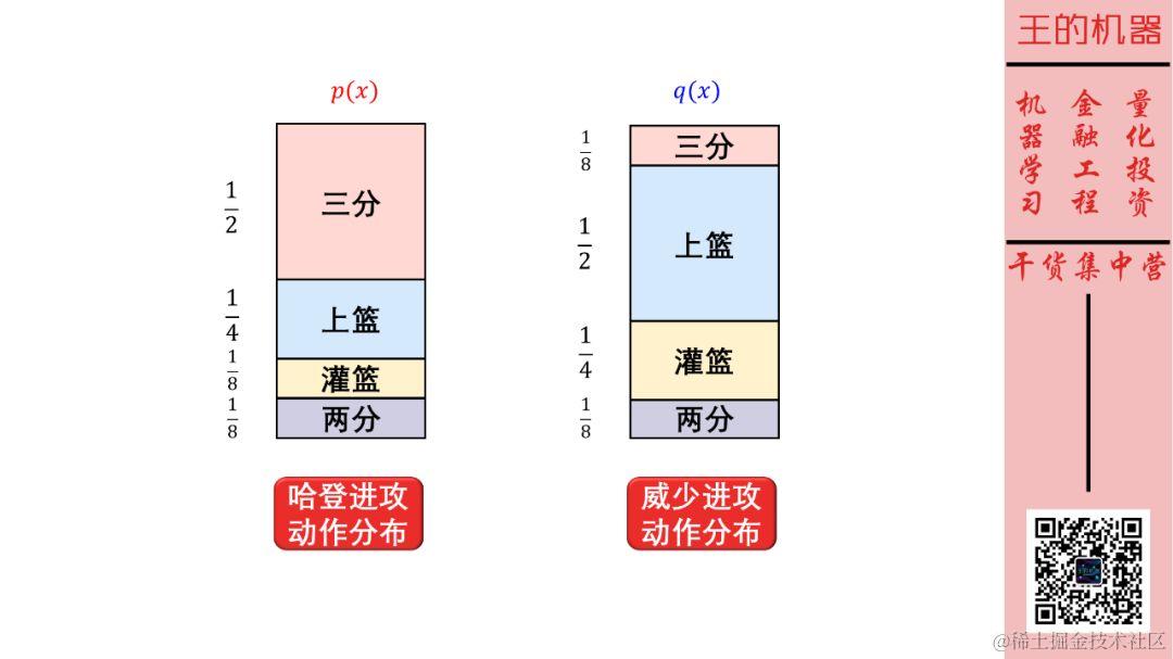 回到我们的场景,把哈登动作分布称为 p 分布,把威少动作分布称为 q 分布,那么 p 分布对 q 分布的 KL 散度定义为