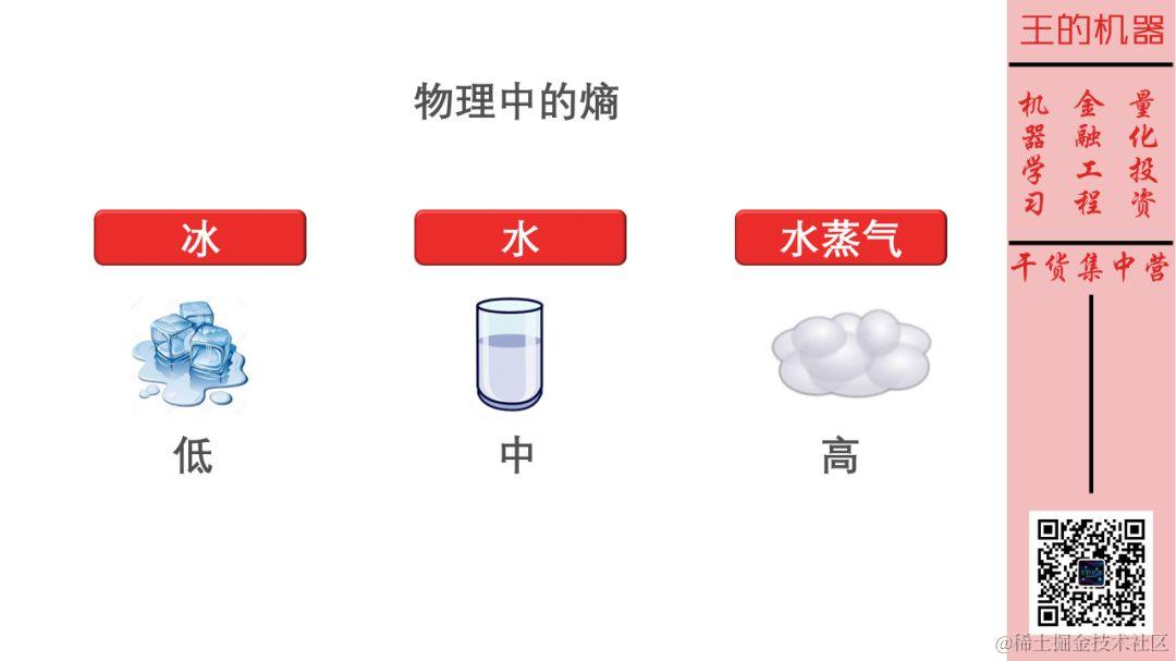 熵(entropy)是物理中的一个概念。如下图,水有三种状态:固态、液态和气态,分别以冰、水和水蒸气的形式存在。