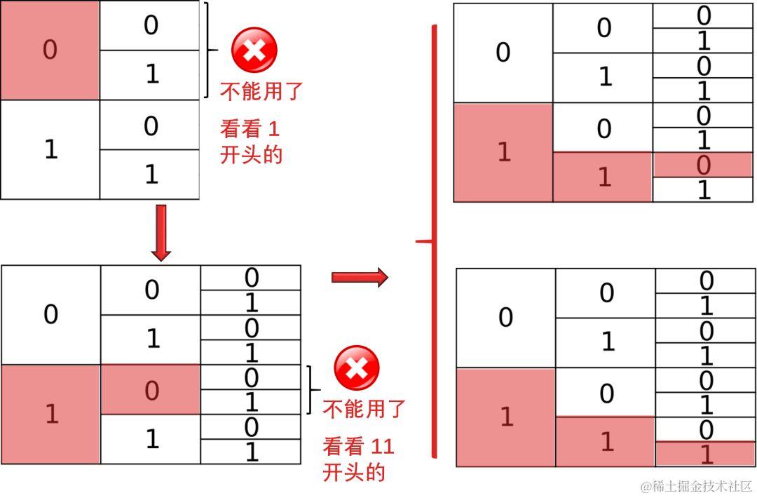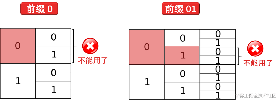 - 如果你用了 01,你就不能再用以 01 开头的其他编码,如 011, 011111 ...