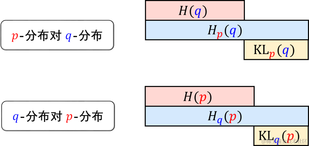 而 q 分布对 p 分布的交叉熵公式如下(把 p 和 q 位置反过来)