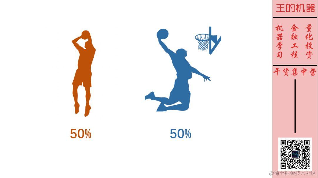 从物理切换到体育,假设马赛克队的哈登每次进攻,50% 机会投篮,50% 的机会灌篮,如下图所示。\