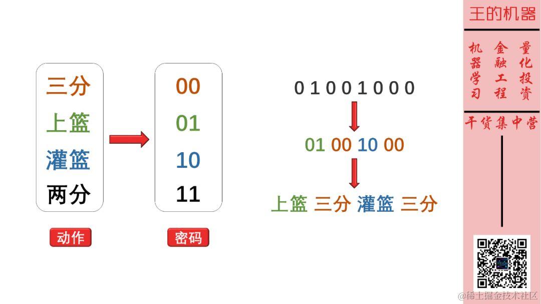 这样,我就可以把小明传的密码分段,然后将每段密码在解码表中找到对应的动作,因此 01001000 就解码成上篮三分灌篮三分。\