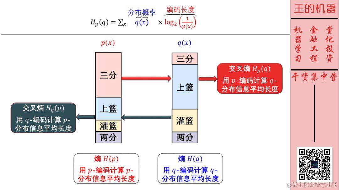交叉熵,即使用针对另一分布制作的密码表对某个分布内的事件进行通讯时的长度,其组成分为两部分:
