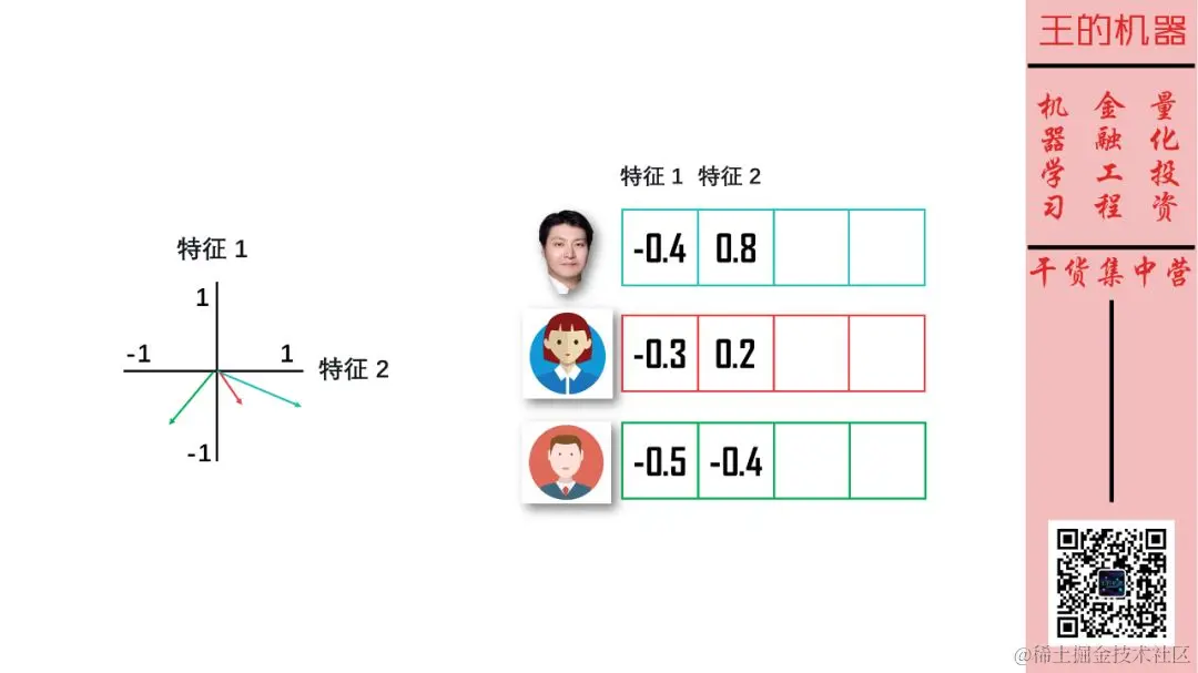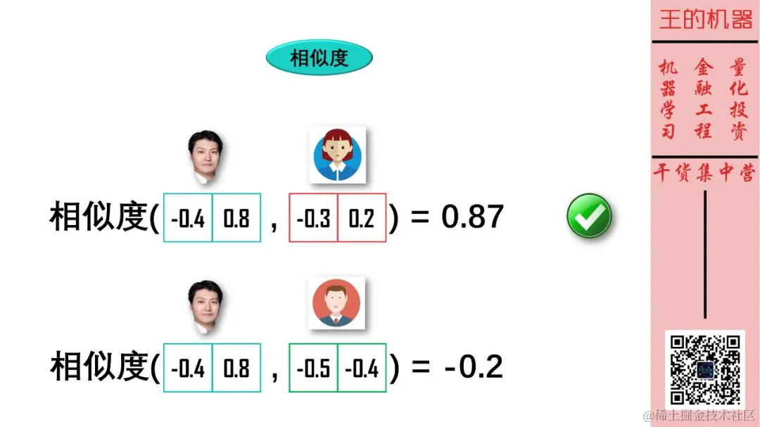 如果两个向量在很多维度上的颜色相同,那么这两个向量相似。