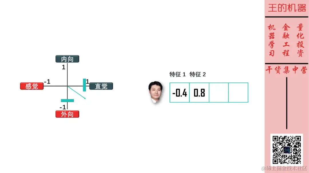 这样斯蒂文在「外向-内向」维度由一个实数 -0.4 来表示,该维度可看成是描述斯蒂文性格的一个特征。\
