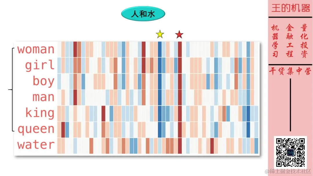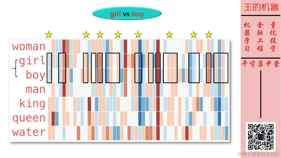 国王和皇后非常相似,但是它们的相似处 (用黄色五角星标注了) 在 (女人,男人)、(女孩,男孩) 这些「词对」中没有体现。该特征应该是有皇家色彩 。