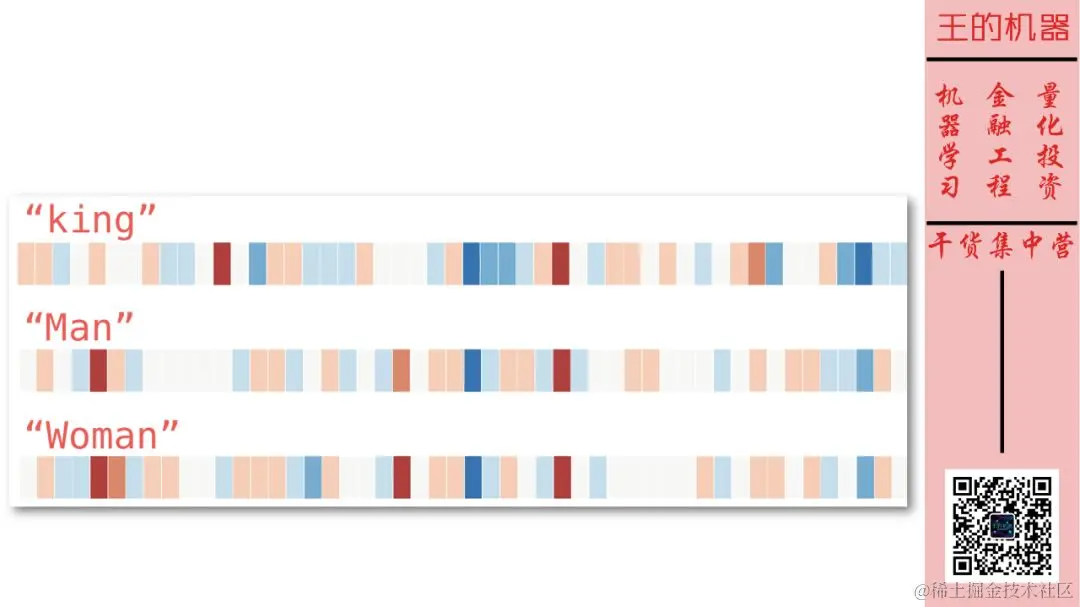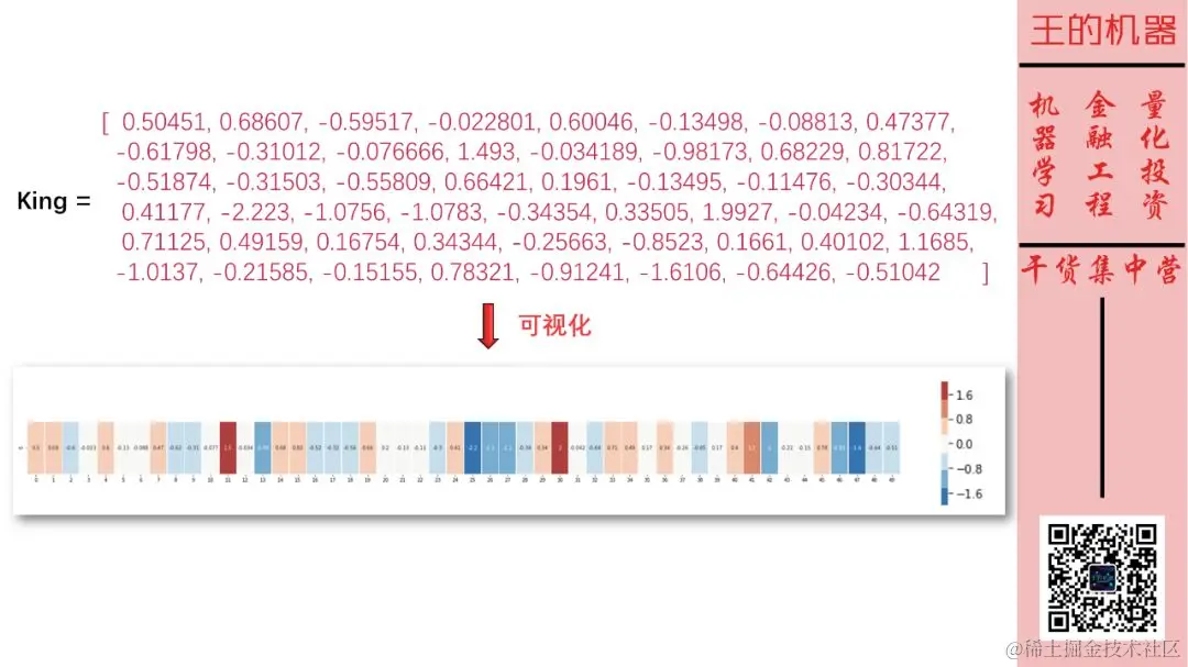 词嵌入的技术本帖当然不谈,要不小孩就看不懂了 (当然比性格嵌入的技术复杂)。先看看词嵌入的结果向量,以 King 举例。