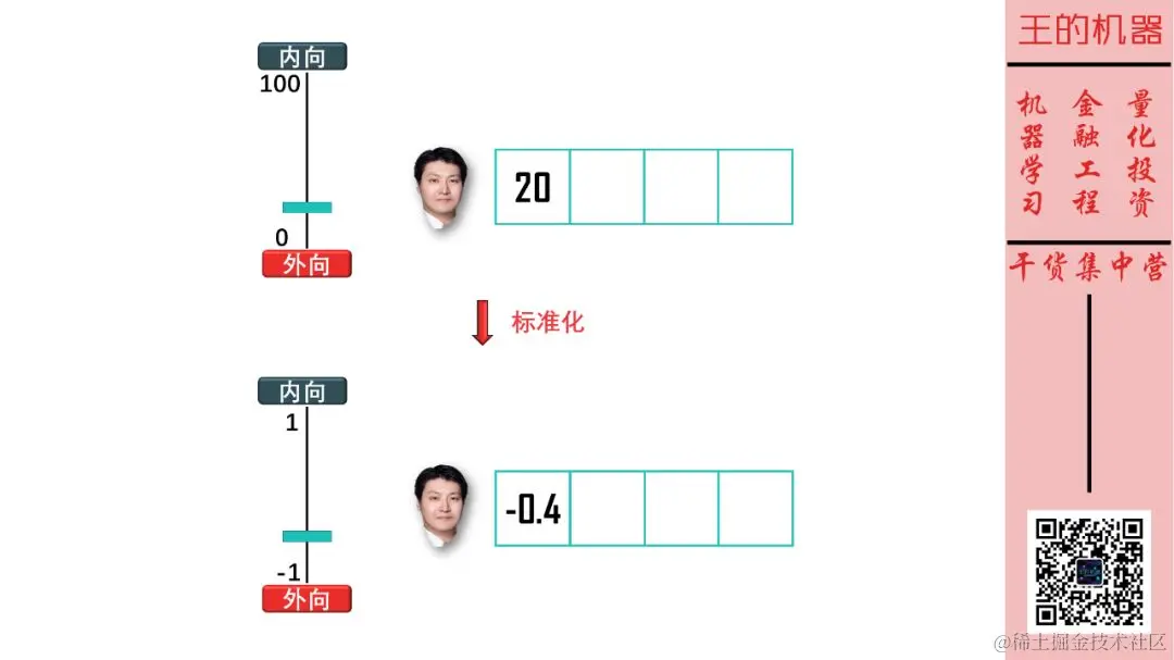 人是复杂的动物,一个特征不可能完全描述人的性格,斯蒂文在第二个特征上给自己打分为 0.8 (按同样的方法,先在 0~100 之间得分,再标准化)。\