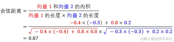 这里向量相似度是用余弦距离来计算,其值范围在 -1 到 1 之间,值越大 (1) 越相似,值越小 (-1) 越相反。对数学感兴趣的小孩 可以参考计算余弦距离的公式。