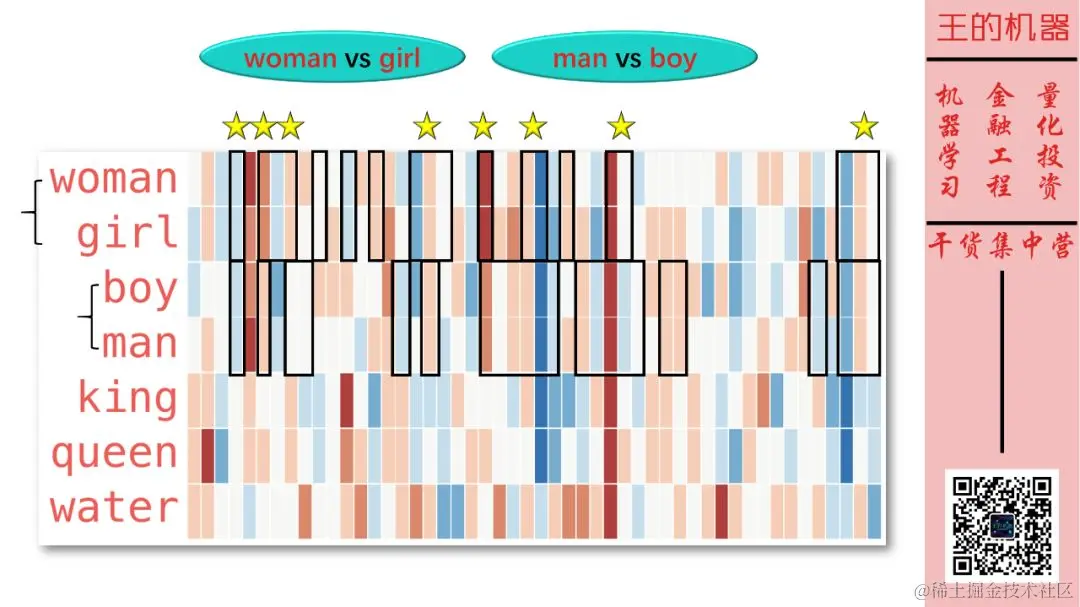 女人和女孩非常相似 (都是女性),男人和男孩也非常相似 (都是男性),而且两对词的相似点也很多重叠 (用黄色五角星标注了),可能显示着「成年人和未成年人」的关系。