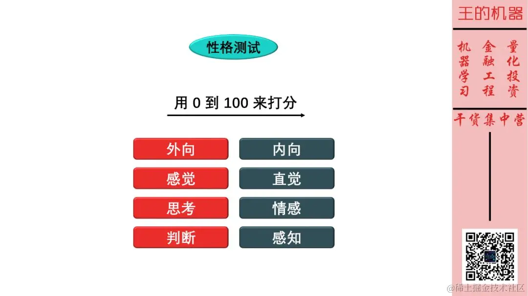 场景:斯蒂文的新工作面试到了最后一轮,拿到 offer 基本已定,只需要完成一个性格测试,从不同维度上给自己在 0 到 100 的范围打分。