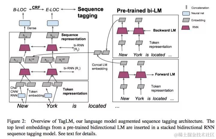这个时候该句子经过预训练好的两个RNN网络,得到New的前后RNN输出表示,与之前的网络隐层进行拼接,输入到第二层RNN网络中,进行序列标注。