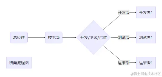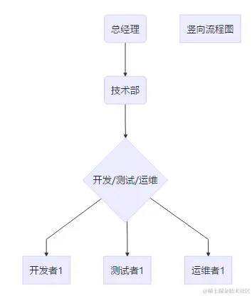 ``` graph TD A(总经理) --> B(技术部) B --> C{开发/测试/运维} C --> D[开发者1] C --> E[测试者1] C --> F[运维者1] G[竖向流程图] ```标准流程图