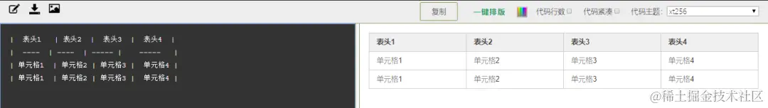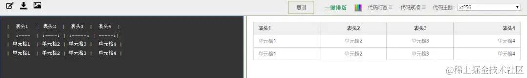:-::将表头及单元格的内容居中对齐;| 表头1 | 表头2 | 表头3 | 表头4 | | :---- | :----: | :-----: | -----:| | 单元格1 | 单元格2 | 单元格3 | 单元格4 | | 单元格1 | 单元格2 | 单元格3 | 单元格4 |支持 HTML 元素