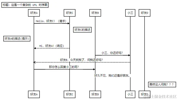 ```sequence Title: 标题:这是一个复杂的 UML 时序图 好友A->好友C: Hello,好友C!(请求) Note right of 好友C: 好友C的描述 Note left of 好友A: 好友A的描述(提示) 好友C-->好友A: Hi,好友A!(响应) 好友B->小三: 小三,你还好吗? 小三-->>好友A: 好友B,今天找我了,问我还好吗? 好友A->好友B: 那你怎么回复小三的呢? Note over 小三,好友B: 好久不见,我们还是好朋友。 participant 好友D Note right of 好友D: 居然没人问我???```除了上面举例的