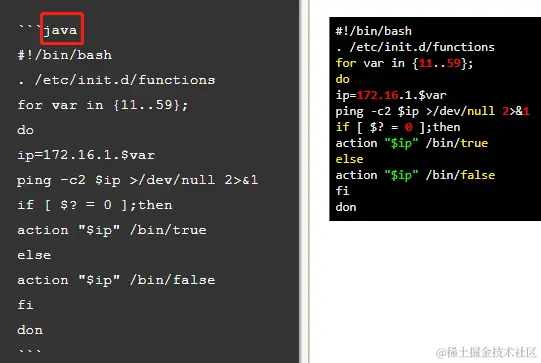 java、cpp、css、xml、javascript、python、php、go、kotlin、lua、objectivec等等)时,在头部直接指定,如:```java#!/bin/bash . /etc/init.d/functions for var in {11..59}; do ip=172.16.1.$var ping -c2 $ip >/dev/null 2>&1 if [ $? = 0 ];then action "$ip" /bin/true else action "$ip" /bin/false fi don链接