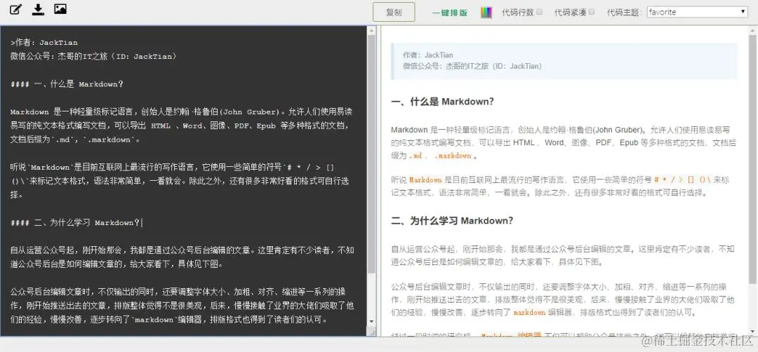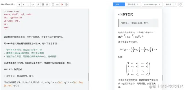 md2all编辑器编写好后,然后复制粘贴到公众号,所有的样式渲染地很完美,包括图片加载等等,且格式也不会变的很乱。 (备注:这里有修改)推荐一个神网站mdnice.com,可以将Markdown源文件复制Markdown编辑器,预览窗口即可显示效果,并可以复制到微信公众号或者知乎。