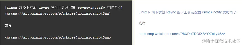 [链接名称](链接地址) 或者 <链接地址>[Linux 环境下实战 Rsync 备份工具及配置 rsync+inotify 实时同步](https://mp.weixin.qq.com/s/P8XDrr7ROIXBYOZnLy45zA) 或者 <https://mp.weixin.qq.com/s/P8XDrr7ROIXBYOZnLy45zA>除此之外,链接还可以用变量来代替。