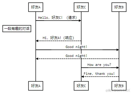 ```sequence 好友A->好友C: Hello,好友C!(请求) Note left of 好友A: 一段有趣的对话 好友C-->好友A: Hi,好友A!(响应) 好友A->好友B: Good night! 好友B-->好友A: Good night! 好友C->好友B: How are you? 好友B-->好友C: Fine,thank you! ```UML 复杂时序图
