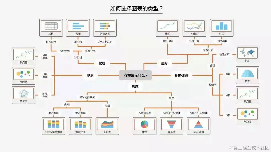 在平常的学习中要找到适合本队的题目,是数据分析题,还是优化的题目等。如果选择数据分析的话,就要对数据分析比较了解,需要掌握数据如何可视化,选什么图,才能更能够刻画数据的特点。如果不知道选择什么种类的图,可以参照下面的图: