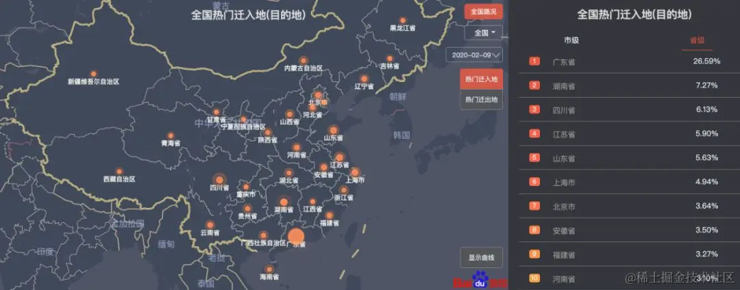 在全国各省份中,广东省成为全国热门迁入地第一位。从 2 月 7 日开始,广东省人口迁入比例从百分之十几提高至 20% 以上,2 月 9 日,这一数字达到 26.59%, 远远超出其它省份。