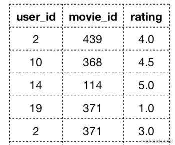 假设我们正在构建一个电影推荐系统。该系统不知道用户或电影的先验知识,只知道用户通过对电影进行评级而与电影之间的互动。这里有一个 dataframe,它由电影 ID、用户 ID 和电影的评级组成。