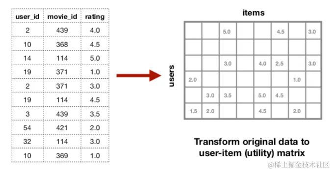我们需要首先将电影评分数据转换成一个用户-物品矩阵,也称为效用矩阵。