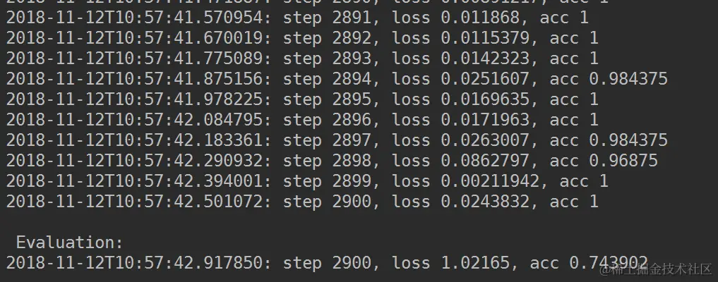 print("{}: step {}, loss {:g}, acc {:g}".format(time_str, step, loss, accuracy))