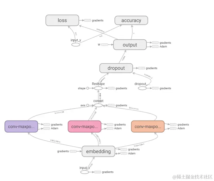 这里再注释一下filter_sizes和num_filters。filters_sizes是指filter每次处理几个单词,num_filters是指每个尺寸的处理包含几个filter。