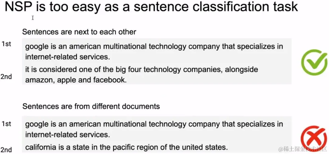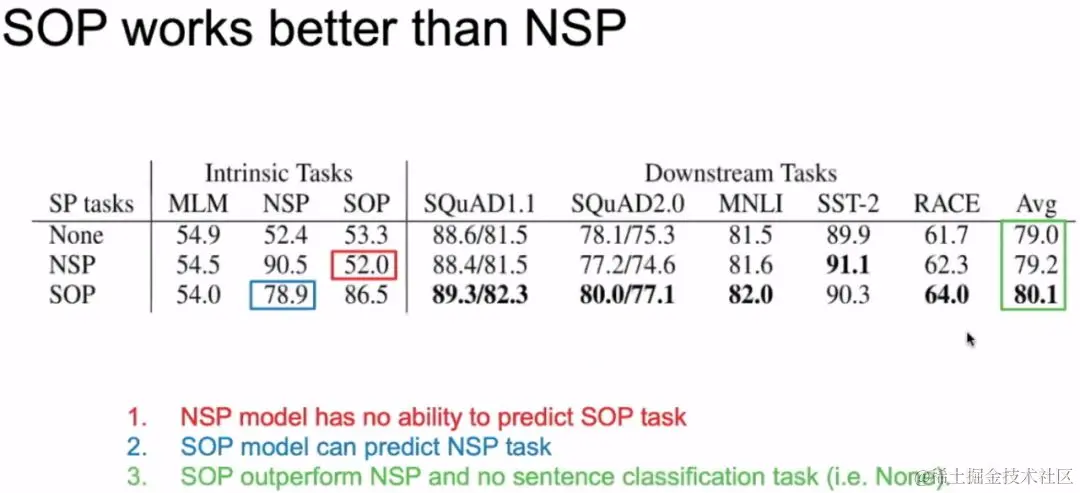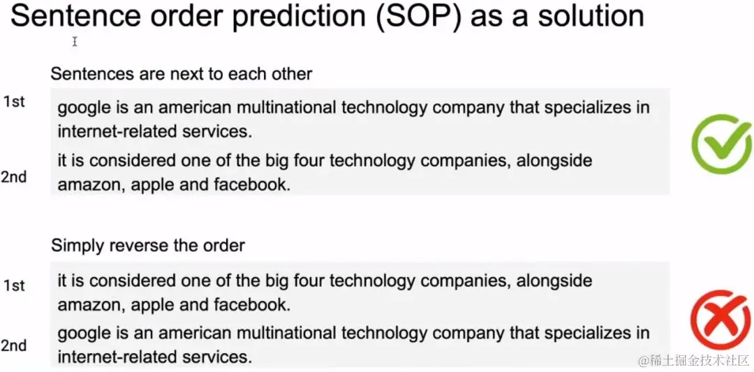 这个预训练策略也算是一个创新点,SOP 全称为 Sentence Order Prediction,其用来取代 NSP 在 BERT 中的作用,毕竟一些实验表示NSP非但没有作用,反而会对模型带来一些损害。SOP的方式与NSP相似,其也是判断第二句话是不是第一句话的下一句,但对于负例来说,SOP并不从不相关的句子中生成,而是将原来连续的两句话翻转形成负例。