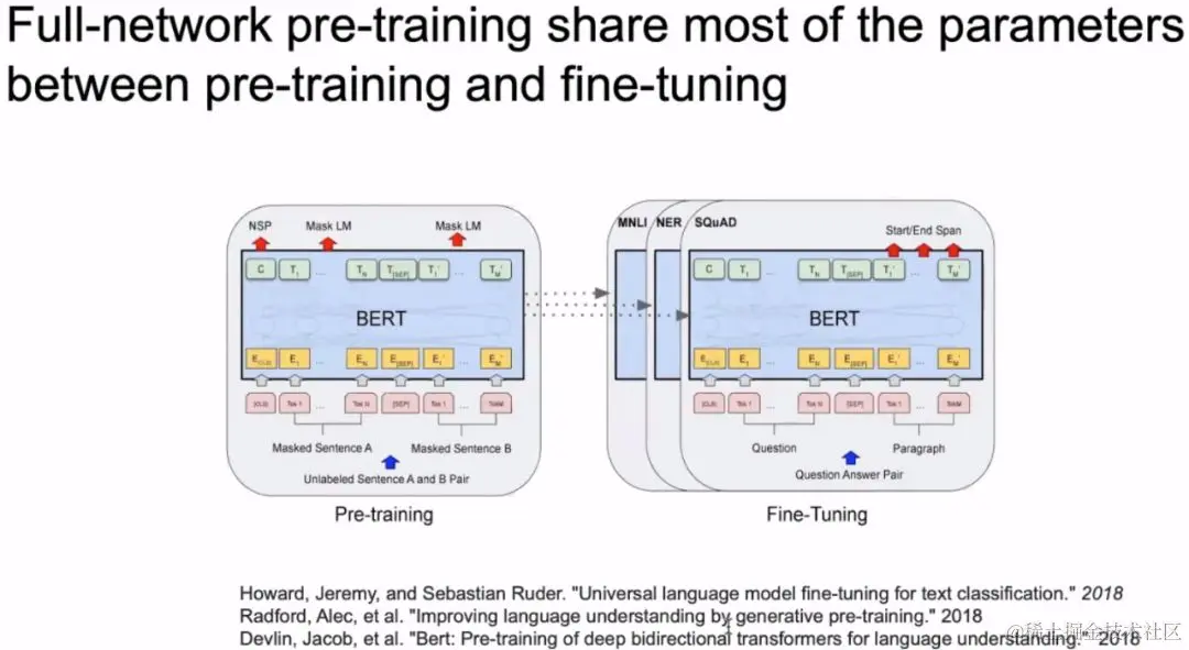 这两年我们在自然语言处理方面有很大的进展,突破性进展主要来源于“全网络预训练的算法”,主要包括上图中的三篇论文(GPT、BERT等)。全网络预训练的意识是预训练和下游任务是基本上共享大部分参数。像之前的Skip-gram、Continuous Bag of Words(CBOW)只是训练词嵌入部分,这部分参数比较小,如果要做下游任务,还要在这上面添加很多的参数,从头开始训练,这就使得在训练下游任务时需要很多的训练数据。