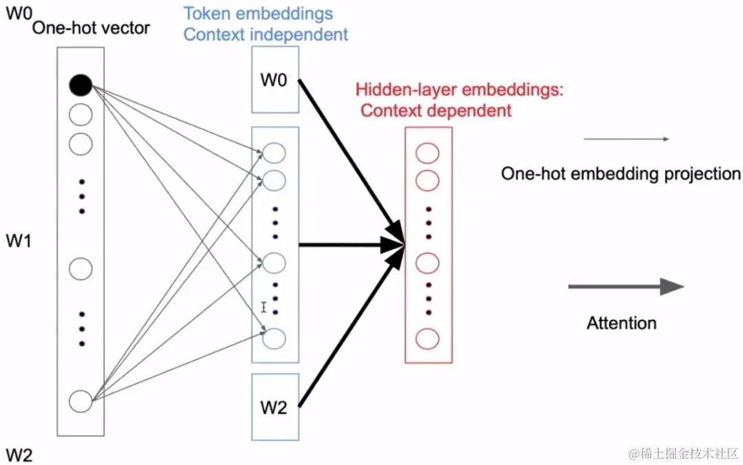 下图表示BERT的One-hot向量输入,第一次投影是词与词之间是没有交互的。只有到了做Attention时,词与词之间才有交互。因此第一次投影不需要很高维度的向量。