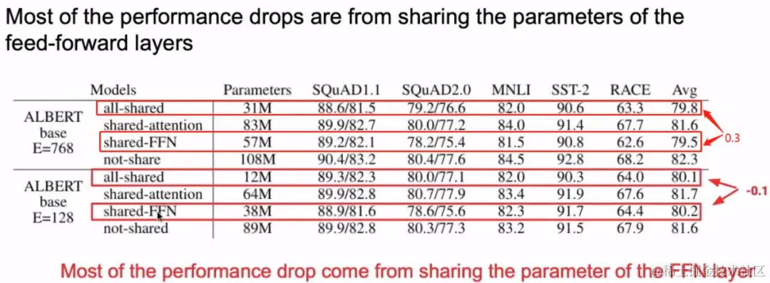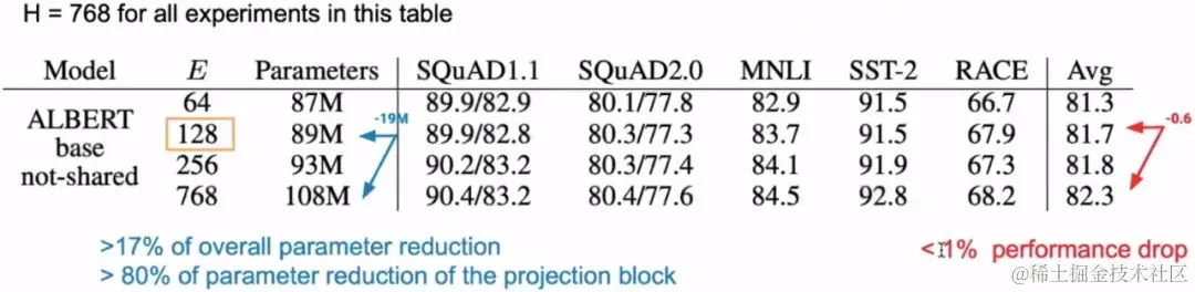 我们以 BERT-Base 为例,Base中的Hidden size 为768, 词表大小为3w,此时的参数量为:768 * 3w = 23040000。如果将 Embedding 的维度改为 128,那么此时Embedding层的参数量为:128 * 3w + 128 * 768 = 3938304。二者的差为19101696,大约为19M。我们看到,其实Embedding参数量从原来的23M变为了现在的4M,似乎变化特别大,然而当我们放到全局来看的话,BERT-Base的参数量在110M,降低19M也不能产生什么革命性的变化。因此,可以说Embedding层的因式分解其实并不是降低参数量的主要手段。