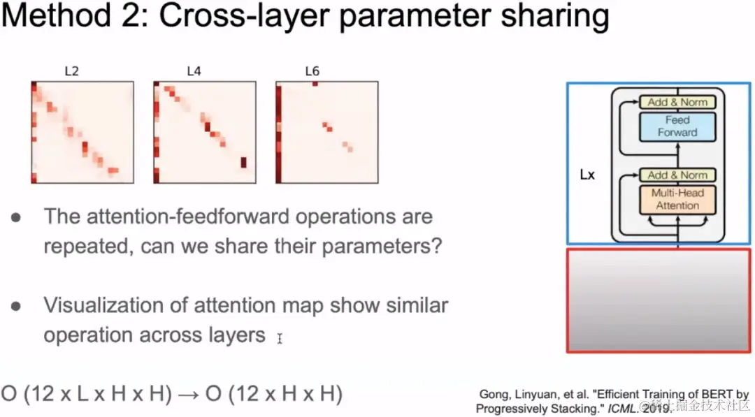 通过论文“Gong L, He D, Li Z, et al. Efficient training of bert by progressively stacking[C]//International Conference on Machine Learning. 2019: 2337-2346”受到启发,每一层的Transformer中Attention关注的都是相似的地方,因此每一层可以做权值共享。