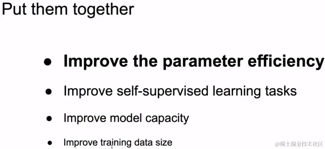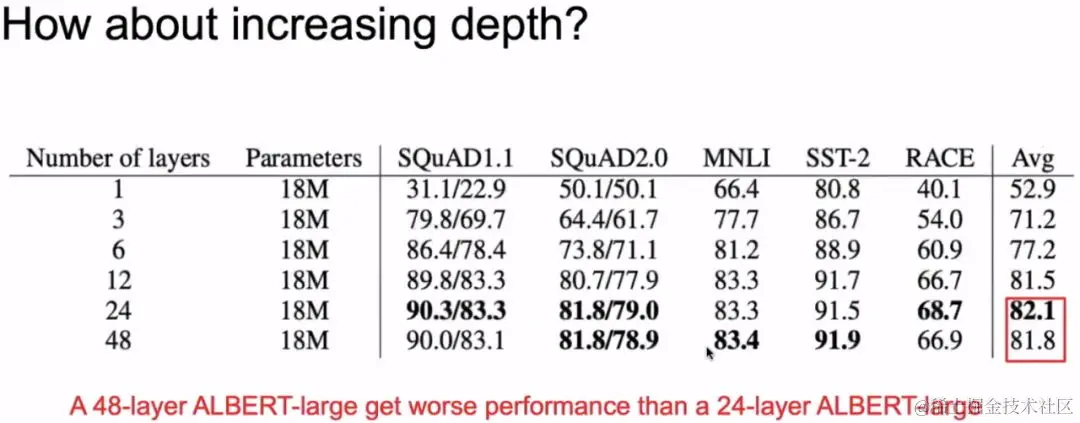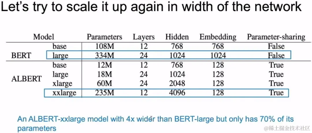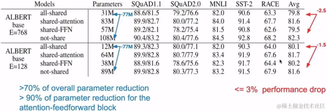 思考问题:Can we have more efficient ways of using parameters?我们能不能在大量减少参数的情况下,不减少或者稍微减少模型的精度呢?这就是ALBERT的主题。