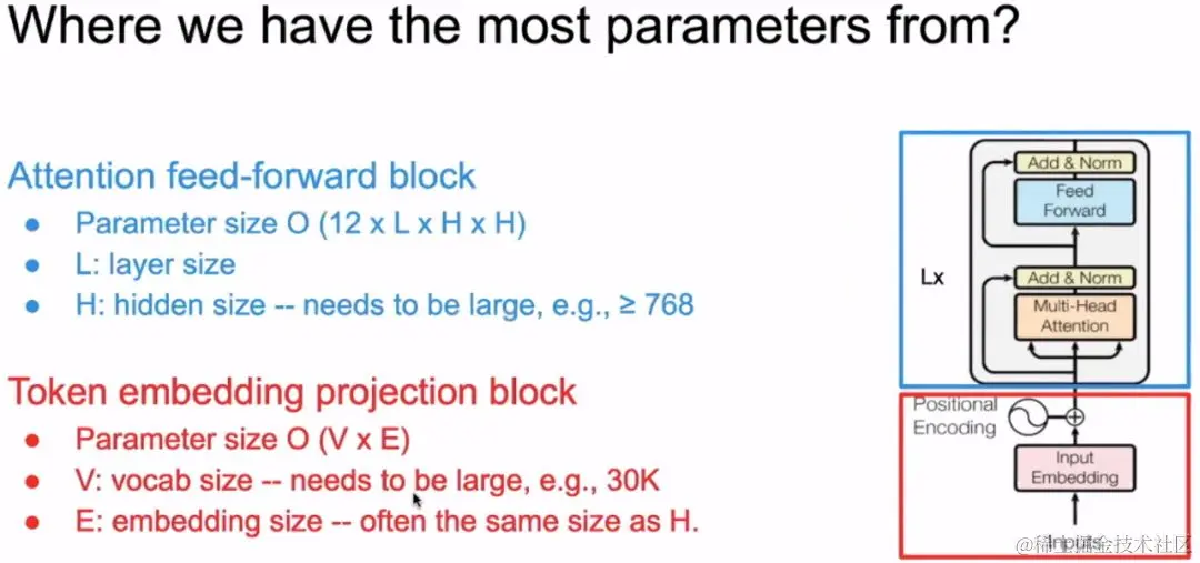 上图中,Attention feed-forward block占总共参数的80%左右,Token embedding projection block占参数的20%左右。\
