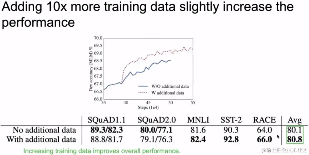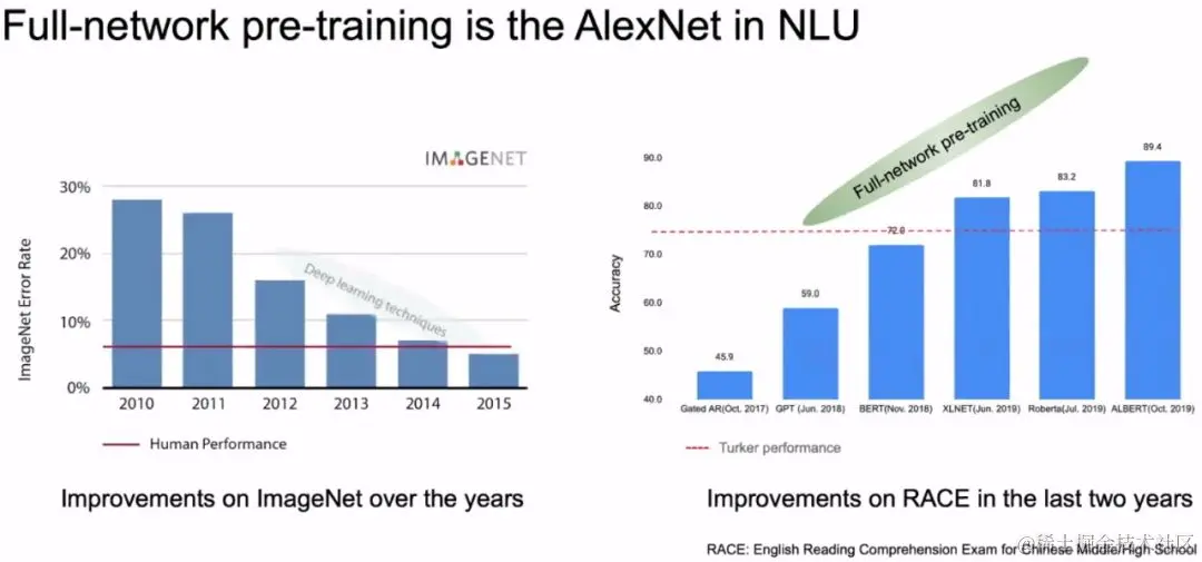全网络预训练模型到底有多强大呢?这里跟AlexNet做了一个对比,Alext基本上是点燃人工智能的导火索。下图中左边是ImageNet的Error的图像,2012年的时候,Error方面有个陡降,这是因为Alext的原因,之后每一年Error都会有一个大降,由于深度学习带来的好处。下图中右边,2017年RACE数据集发布的时候,用的方法是local pre-training(类似于Skip-gram、CBOW),准确率是45.9%。18年6月份GPT把精度做到59%,这基本上就是全网络训练了。然后BERT在同年11月,把精度做到72%。然后是XLNET把精度做到81.8%,Roberta把精度做到83.2%,ALBERT把精度做到98.4%。由于全网络预训练的原因,我们把精度翻了一倍,从原来的45.9%到现在的89.4%。