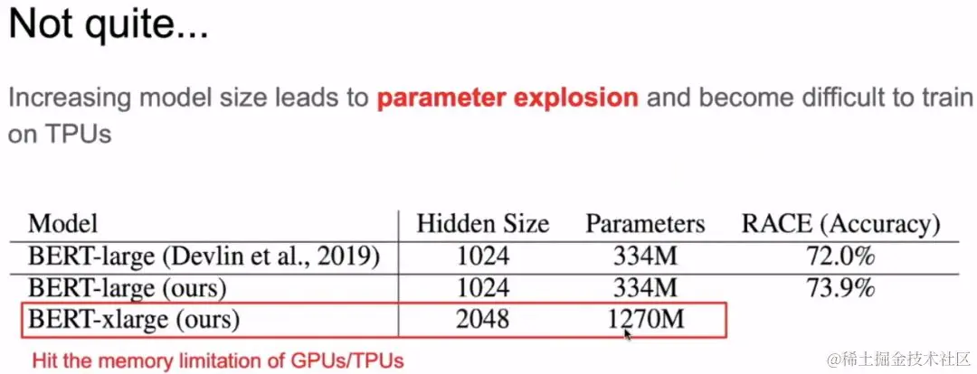 上图是我们先来简单的回顾一下BERT的模型。下图是我们只把BERT的宽度增加到2倍,发现参数已经达到了12亿7千万个,内存直接爆了。