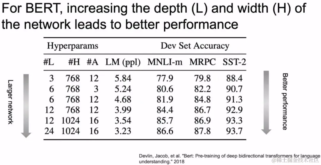 从上图可以看出,AlextNet之后,精度的提升大部分是由于网络深度的增加。下图来源于BERT的论文里,BERT同样做了把网络变宽和变深的实验,发现网络变宽和变深,精度会提升。